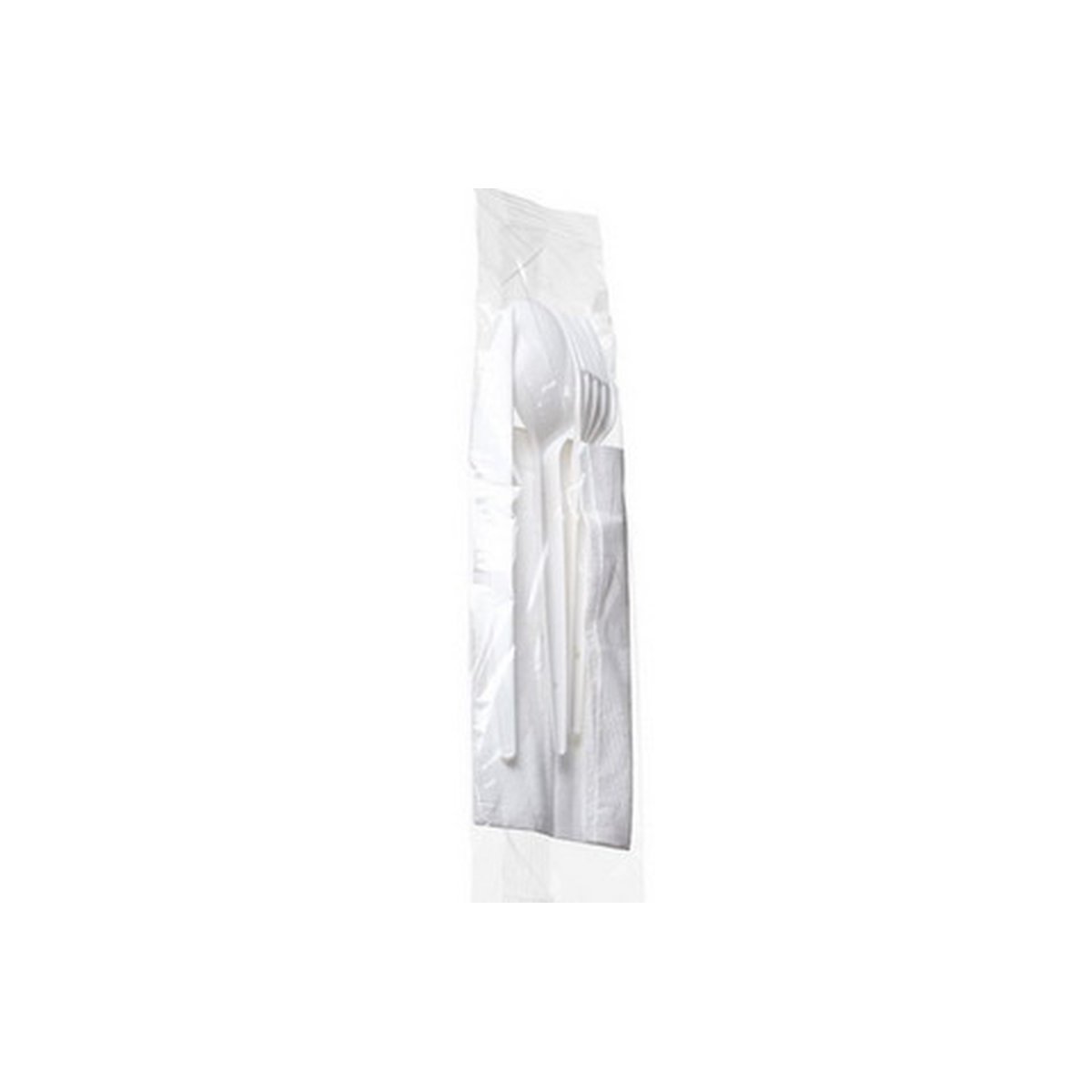 Set completo de cubiertos de plástico desechables que incluye cuchara, cuchillo, tenedor y servilleta.